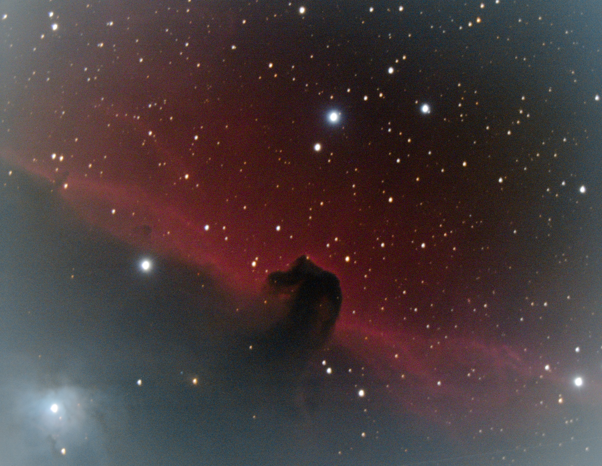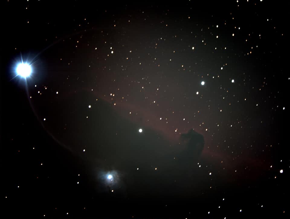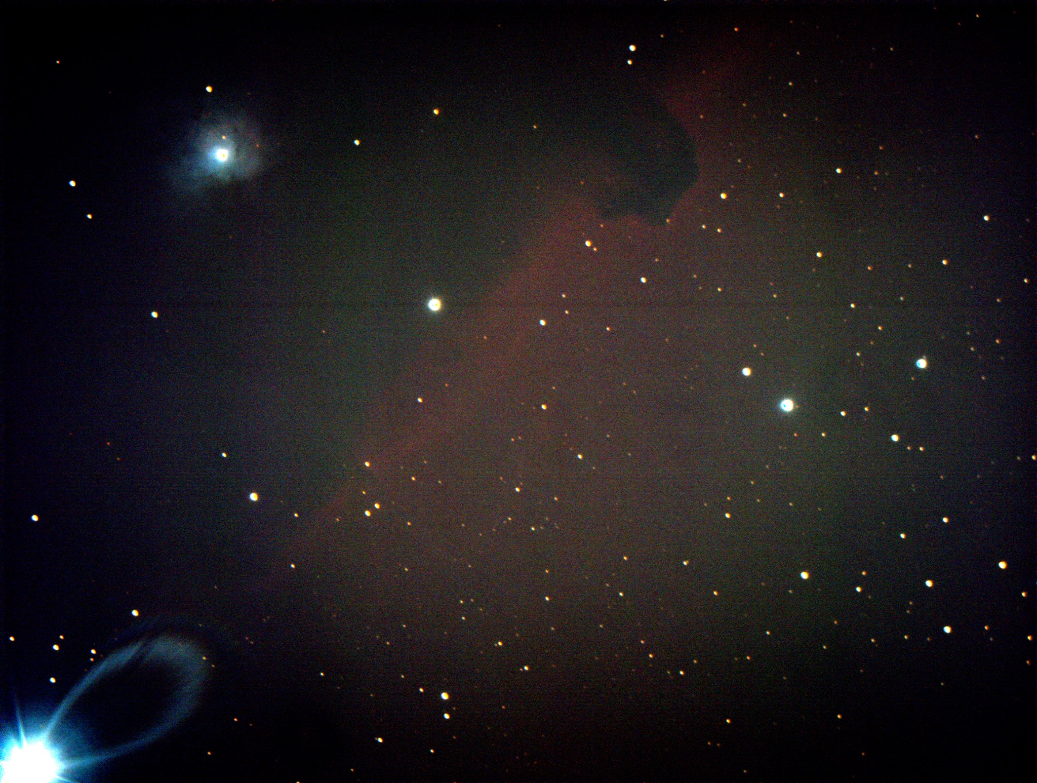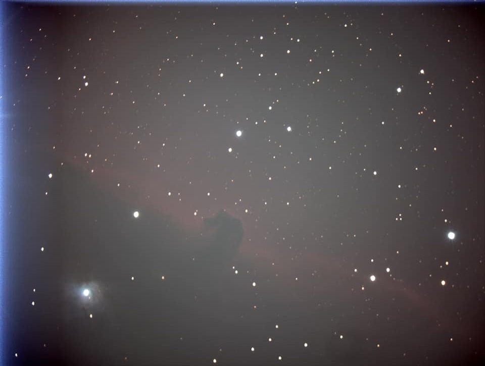 Das Fotografieren des Pferdekopfnebels ist nicht ganz so einfach. Neben der üblichen Problematik mit der schwachen Helligkeit des Objekts kommt hier noch zusätzlich der Stern Alnitak ins Spiel. Dies ist einer der Gürtelsterne des Sternbilds Orion uns im Vergleich zum Pferdekopfnebel sehr hell. Das führt zu diversen Problemen, unter anderem auch Reflexionen. Dies ist im ersten Bild welches ich am 30. März 2019 vom Pferdekopfnebel unten links gut sichtbar.