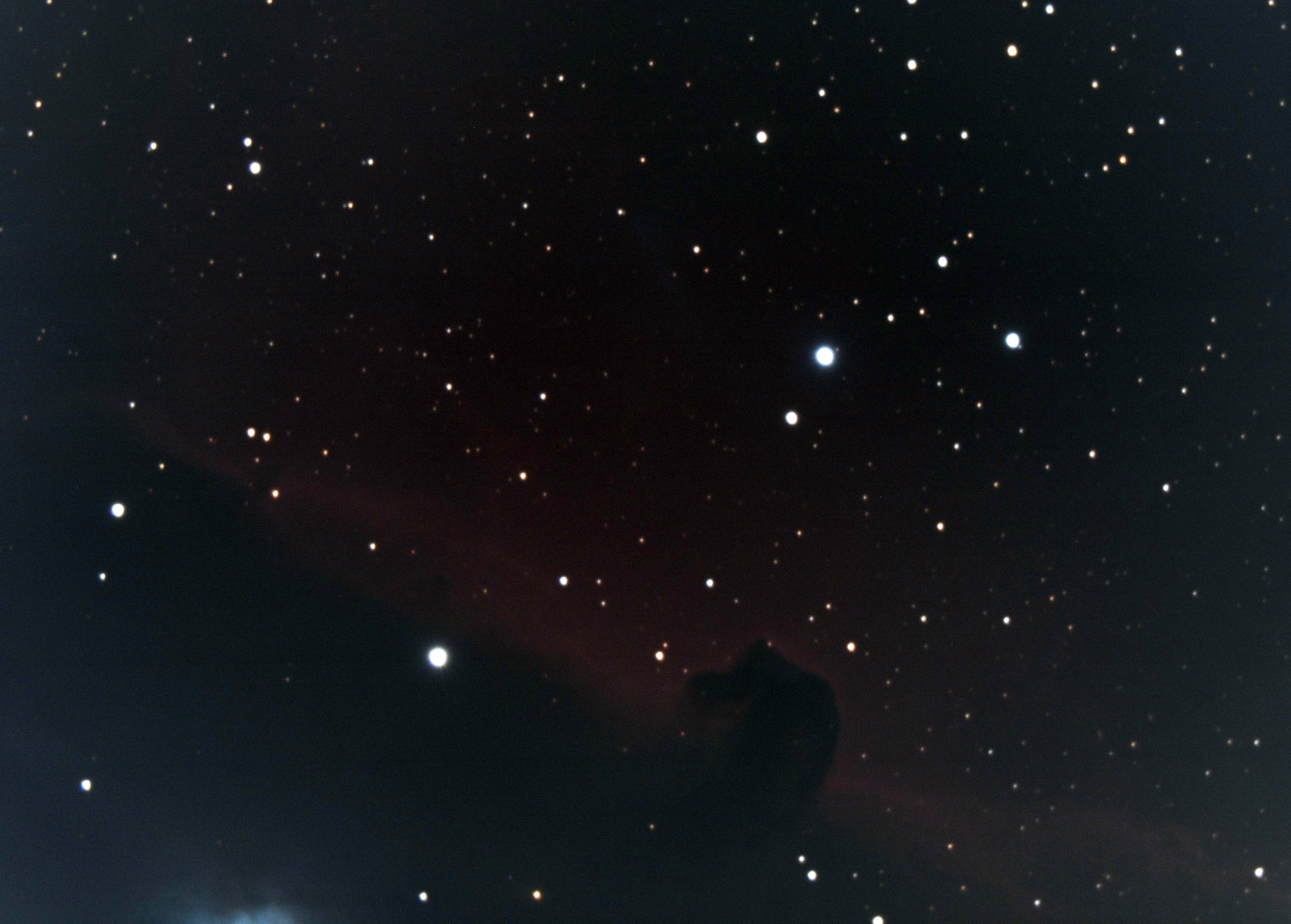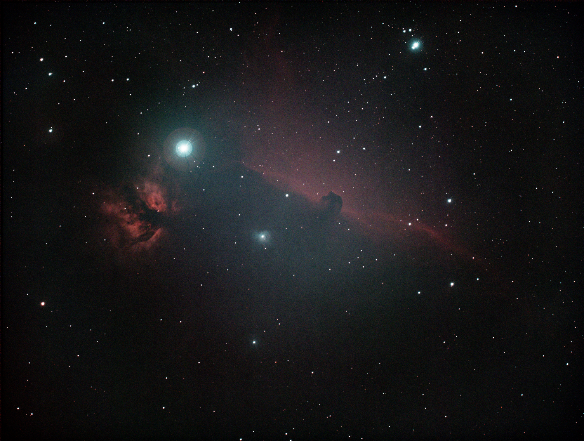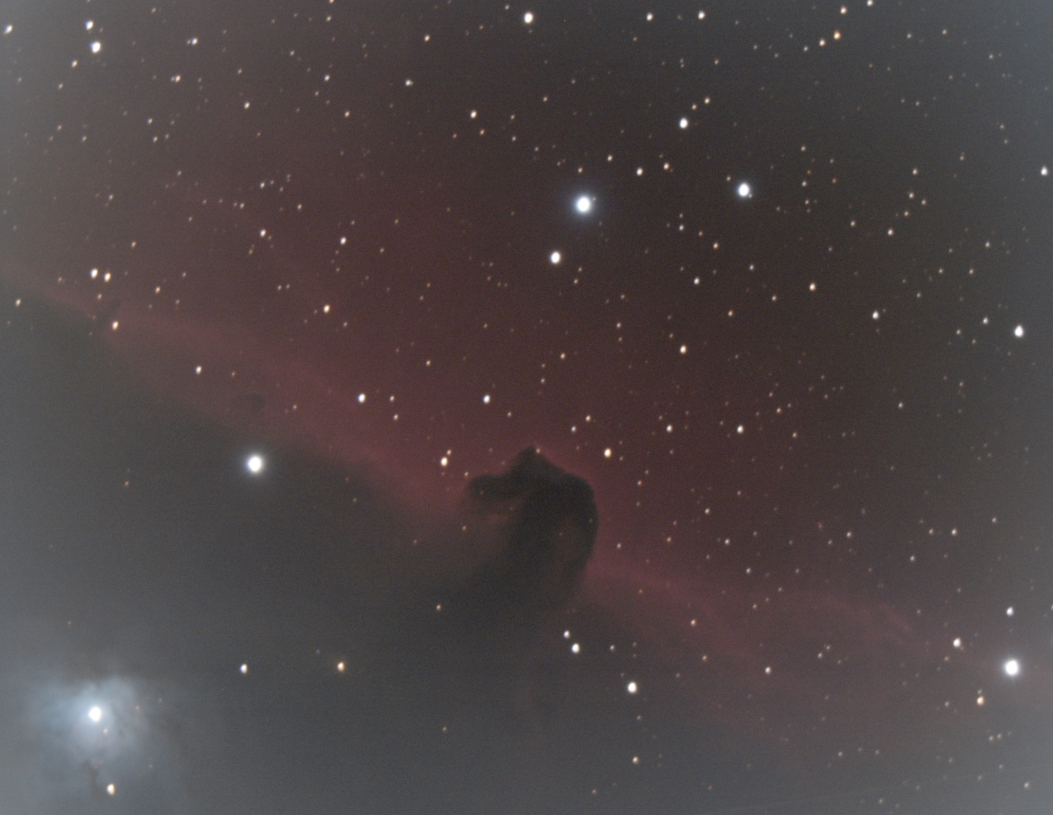Das Fotografieren des Pferdekopfnebels ist nicht ganz so einfach. Neben der üblichen Problematik mit der schwachen Helligkeit des Objekts kommt hier noch zusätzlich der Stern Alnitak ins Spiel. Dies ist einer der Gürtelsterne des Sternbilds Orion uns im Vergleich zum Pferdekopfnebel sehr hell. Das führt zu diversen Problemen, unter anderem auch Reflexionen. Dies ist im ersten Bild welches ich am 30. März 2019 vom Pferdekopfnebel unten links gut sichtbar.