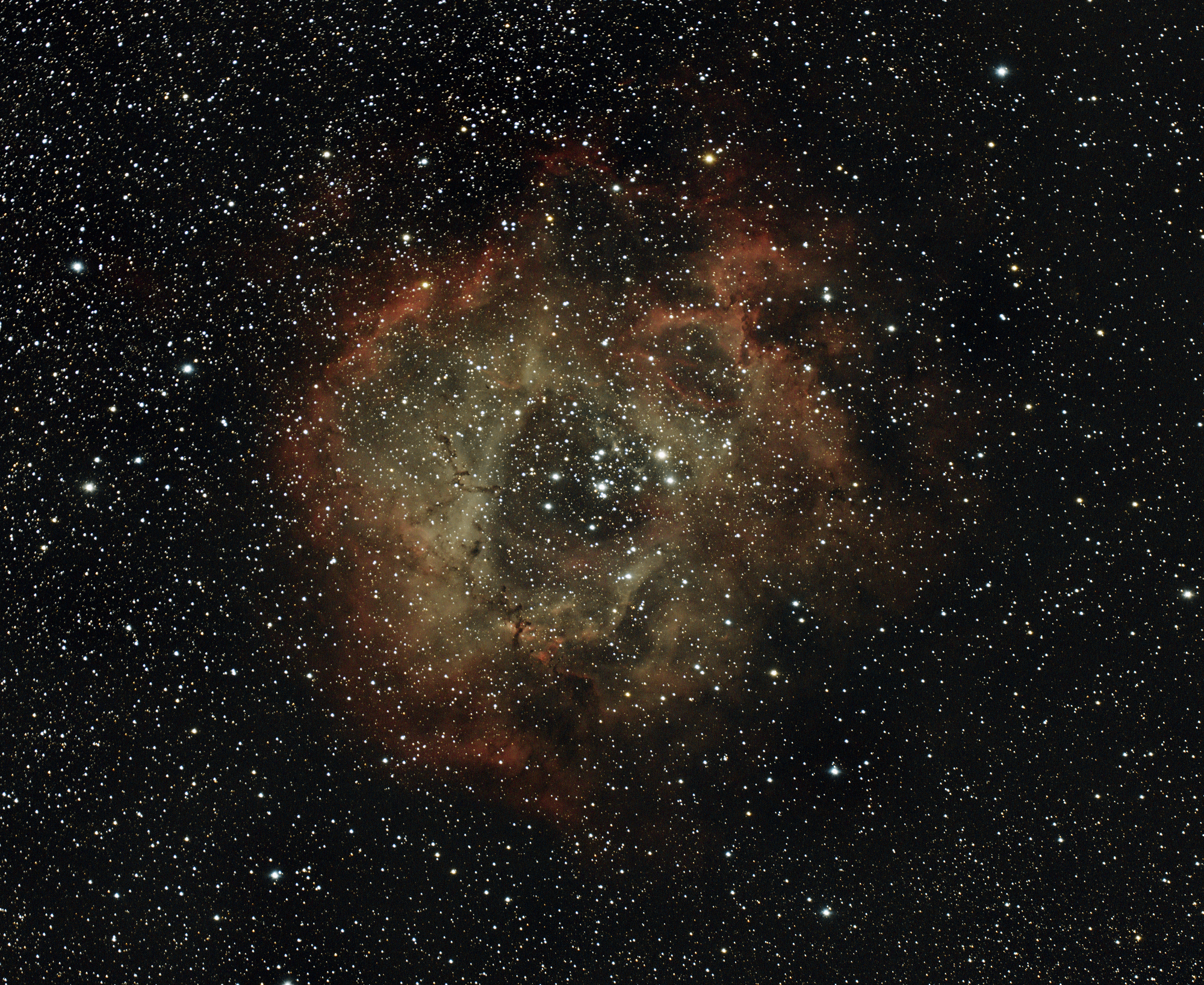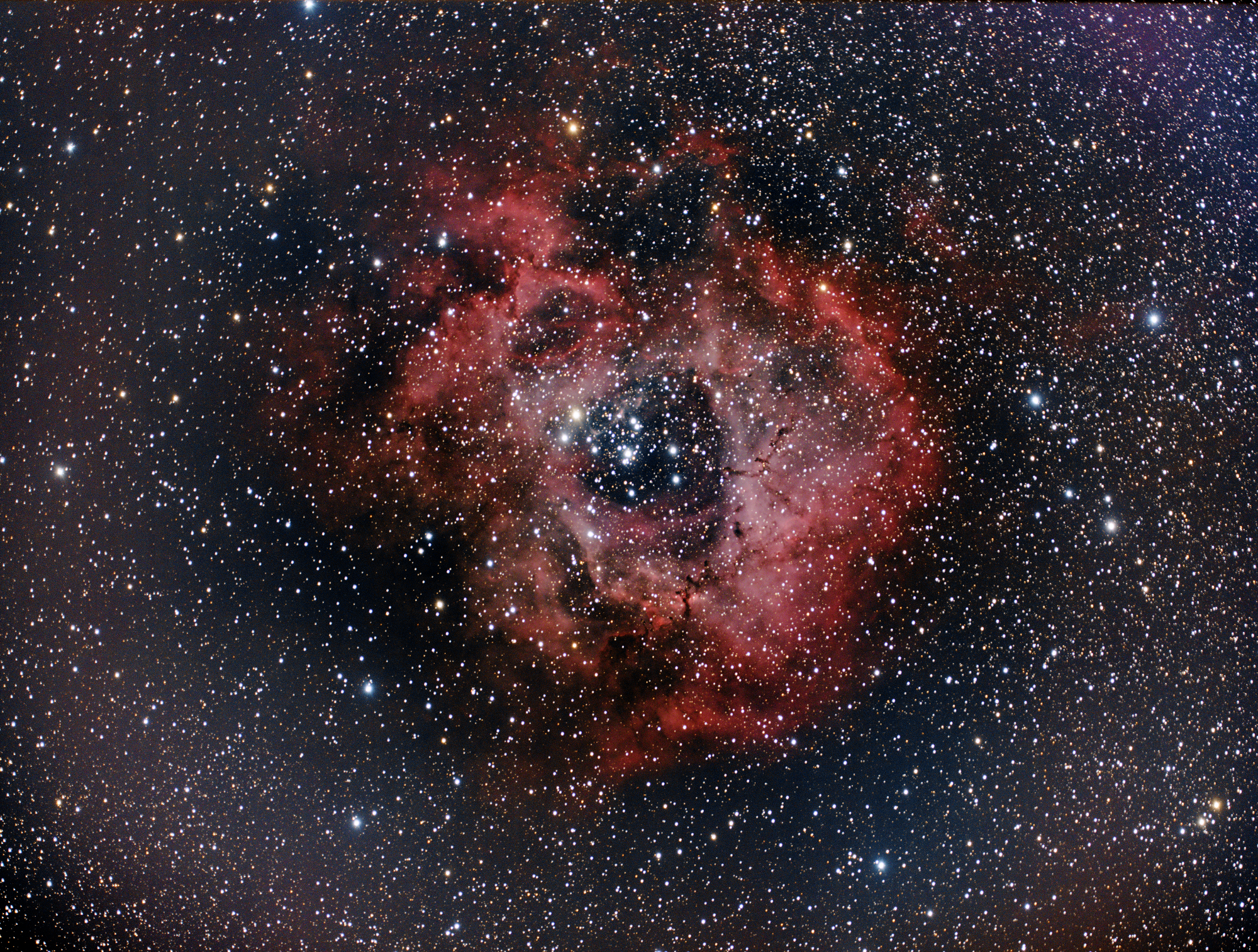 Im Zentrum des Nebels befindet sich der offene Sternhaufen NGC 2244 (identisch mit NGC 2239) welcher den Nebel zum Leuchten bringt. Der Sternhaufen selbst hat eine scheinbare Helligkeit von 4.8 mag.