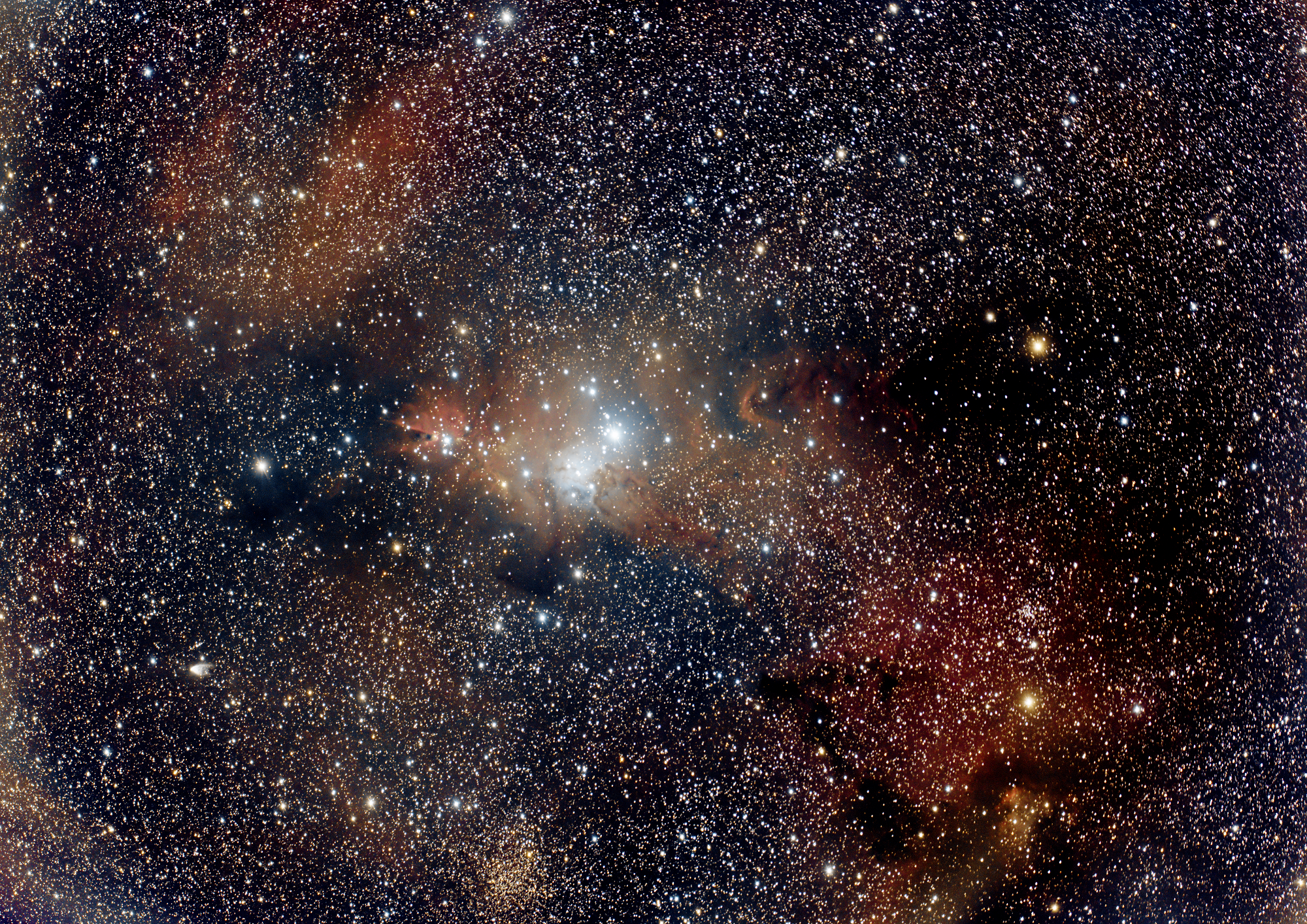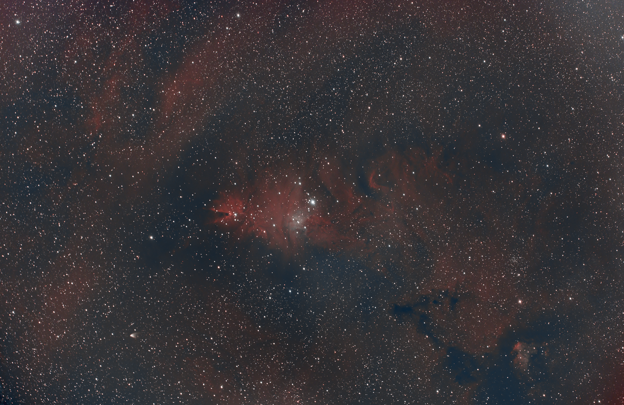 Bei NGC 2264 handelt es sich um ein Gebiet im Sternbild Einhorn, welches aus einem H-II-Gebiet (mit einer Dunkelwolke welche davor liegt, dem Konusnebel), einem Sternhaufen (dem Weihnachtsbaum-Sternhaufen) und einem diffusen Nebel dazwischen. Die Distanz beträgt ca. 2’500 Lichtjahre und die scheinbare Helligkeit beträgt 4.1 mag.